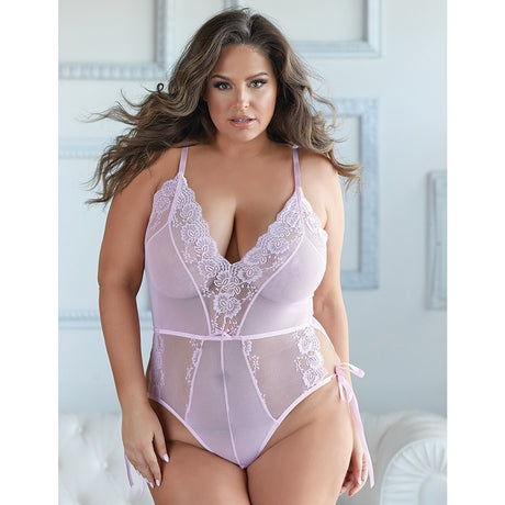 Allure Lace and Mesh Tie Up Romper-Pink 1X/2X-Boxed