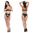 As part of the Exposed by Magic Silk collection, this set features a lace demi bra with adjustable elastic shoulder straps, black tone sliders, and hook-and-eye closures in the back. It also comes with a lace garter adorned with a satin black bow, adjustable straps, black tone sliders, and a matching lace tanga.