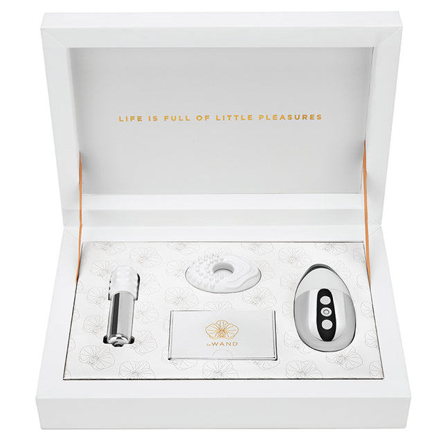 Enhance your daily joy with the Little Pleasures Set from Le Wand. This collection includes two powerful, Silver Chrome mini-vibes that provide instant sensual satisfaction. Both rechargeable vibes, Le Wand Bullet and Point, deliver unique stimulation and are finished in a lustrous Special Edition Silver Chrome. The contoured shape and rumbly motor of Le Wand Point have been approved by Oprah Magazine, while the fan-favorite Bullet features a removable silicone sleeve and ring for added pleasure.
