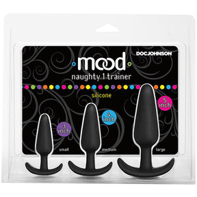 The Mood Naughty 1 Silicone Trainer Set-Black is designed for backdoor beginners looking to gently expand their anal experience. This premium set includes our bestselling original Mood Naughty butt plug in three graduated sizes, measuring 3, 4, and 5 inches. Its classic tapered tip and curved rocker base, made of firm yet flexible silicone, provide comfortable and safe extended wear.