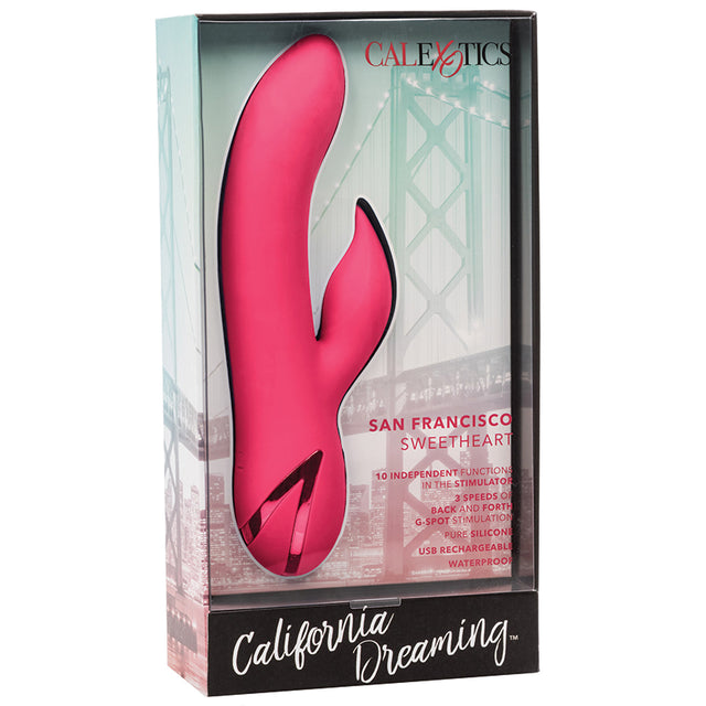 Experience waves of delight and sun-soaked daydreams with the California Dreaming™ San Francisco Sweetheart. This elegant vibrating massager features 10 powerful vibration modes and 3 rhythmic G-spot speeds, providing an unforgettable sensation. Its smooth silicone design and teasing flicker provide thrilling stimulation both in and out of water. Perfect for passionate moments with a partner or solo adventures, the curved tip targets the G-spot while the soft clitoral vibrator delivers sweet external pleasure. Easily customize your experience with separate controls, recharge quickly via USB, and enjoy waterproof fun with body-safe, hypoallergenic silicone.
