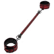 A versatile bedroom bondage tool perfect for couples. The reversible cuff design features a striking black and red colorway. The cuffs are enhanced with soft padding for added comfort during wear. Each cuff is connected to a chain with convenient clips on both sides, allowing for easy unlinking. The spreader bar attaches to the cuffs with dual-ended clips.
