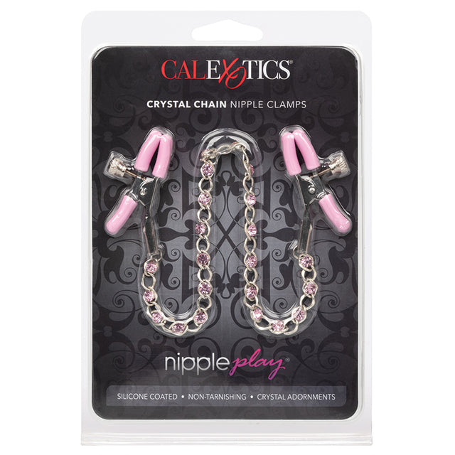Elevate your nipple play experience with the Nipple Play Crystal Chain Nipple Clamps-Pink; These fully adjustable clamps, teasing chain, and sparkling crystals offer an elevated sensation and playful pleasure. Simply adjust the tension of the clamps to stimulate anywhere on your body, increasing blood circulation and intensifying overall arousal. Made with nickel-free iron, silicone cote, and Silica crystals, these easy-to-use nipple teasers are a great addition to any play session.