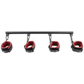 Experience your wildest power dynamics with the Saffron Spreader Bar and Cuff Set. Four adjustable faux leather cuffs, featuring the iconic red and black colors of the Saffron collection, securely buckle around your wrists and ankles. Connect them to the sturdy spreader bar and each other for endless possibilities. The robust spreader bar's welded rings ensure no escaping, only surrender.
