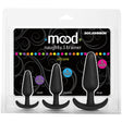 The Mood Naughty 1 Silicone Trainer Set-Black is designed for backdoor beginners looking to gently expand their anal experience. This premium set includes our bestselling original Mood Naughty butt plug in three graduated sizes, measuring 3, 4, and 5 inches. Its classic tapered tip and curved rocker base, made of firm yet flexible silicone, provide comfortable and safe extended wear.