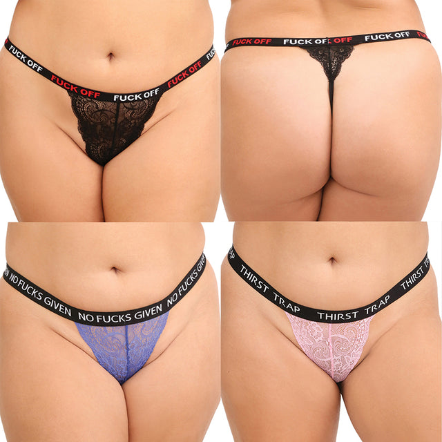 This 3-piece panty pack features lace thongs with the phrases "Fuck Off," "No Fucks Given," and "Thirst Trap."