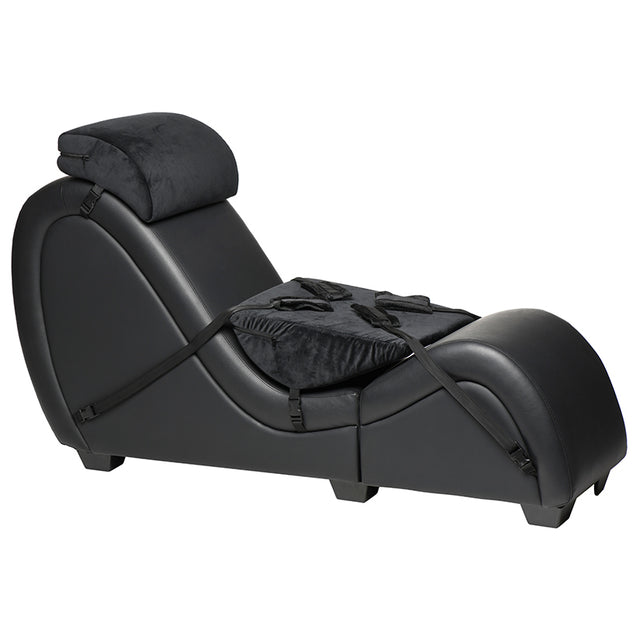This innovative sex chaise lounge allows you to create your own personal sex hideaway at home, even if space is limited. It conveniently breaks down into two pieces for easy storage when not in use, making it perfect for smaller rooms, closets, or storage spaces. You can also easily transport it from place to place by disassembling and reassembling the couch. Crafted with durable wood and metal and covered in vegan-friendly PU leather, this couch is not only sturdy but also easy to clean. The ergonomic design and comfortable construction allow for a variety of positions to be explored. Additionally, the couch comes with two supportive Love Pillows for added comfort and two fleece cuffs for restraining your lover. Assembly is a breeze with the included directions.