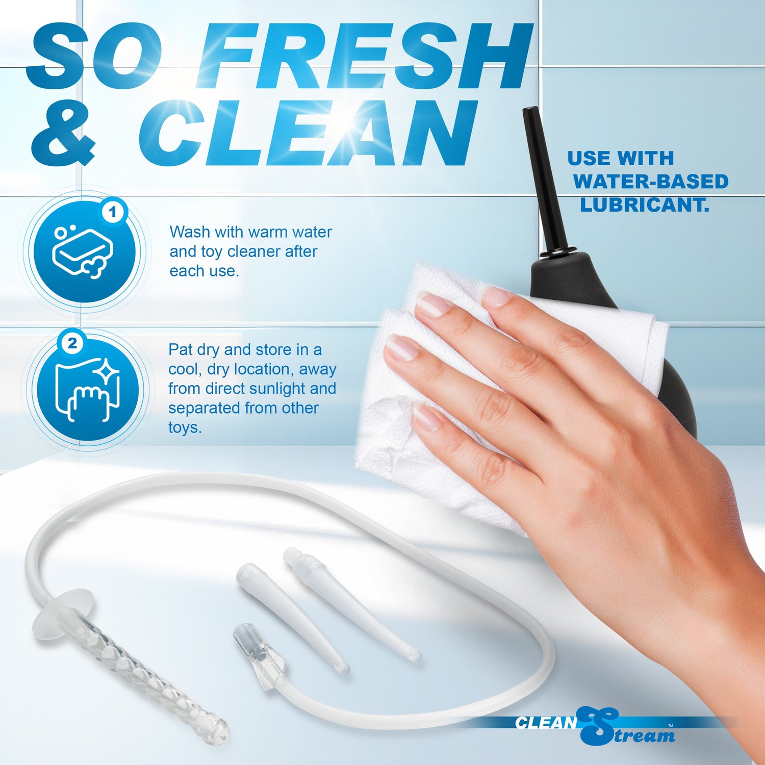 Keep yourself fresh on the go with this lightweight, user-friendly, compact enema kit! The black bulb has a pointed, tapered tip for easy insertion that you can use on its own or along with the tubing and attachments. For those who want to have a little more reach and control, the 23.5 inch tubing combined with one of the attachments lets you find a comfortable position and not have to hold the douche right at your derriere. Instead, you can easily find a comfortable spot and hold the enema bulb comfortably in your hand as you fill up your booty with fresh water or fluids! Use one of the three attachments and get a personalized touch; enjoy either of the two, smooth, tapered attachments or give yourself some stimulation with beaded and tapered attachment. All three connect securely to the end of the tubing which has the added safety feature of a flanged, wide end. Wash with warm water and toy cleaner after each use. Feel free to soak items in warm water and soap for a deeper clean. Pat dry and store in a cool, dry location, away from direct sunlight and separated from other toys.